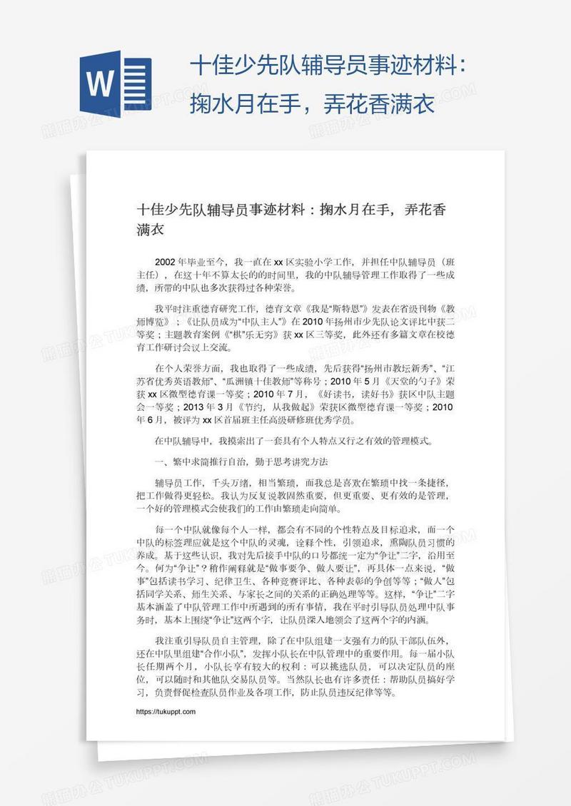 本作品为十佳少先队辅导员事迹材料:掬水月在手,弄花香满衣, 编号:71mdm270d1, 格式为 docx, 大小1 MB, 本作品下载后,先解压,解压之后用推荐软件 Word(2010) 打开, 然后进行编辑功能。
