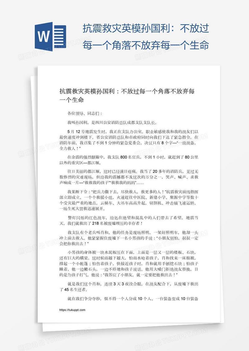 本作品为抗震救灾英模孙国利:不放过每一个角落不放弃每一个生命, 编号:71mdm3dn41, 格式为 docx, 大小1 MB, 本作品下载后,先解压,解压之后用推荐软件 Word(2010) 打开, 然后进行编辑功能。
