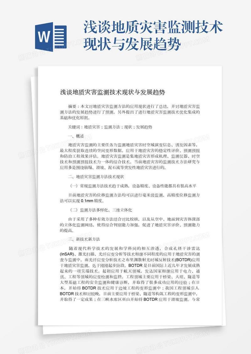 本作品为浅谈地质灾害监测技术现状与发展趋势, 编号:71mdm4g2d1, 格式为 docx, 大小1 MB, 本作品下载后,先解压,解压之后用推荐软件 Word(2010) 打开, 然后进行编辑功能。