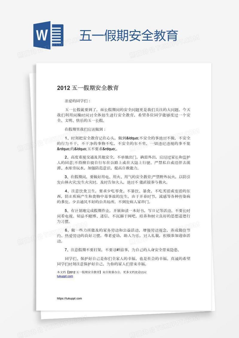 本作品为五一假期安全教育, 编号:71mdmj0j41, 格式为 docx, 大小1 MB, 本作品下载后,先解压,解压之后用推荐软件 Word(2010) 打开, 然后进行编辑功能。