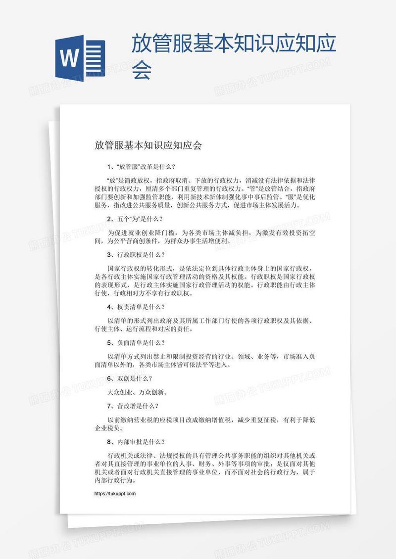 本作品为放管服基本知识应知应会, 编号:71mdmk6r41, 格式为 docx, 大小1 MB, 本作品下载后,先解压,解压之后用推荐软件 Word(2010) 打开, 然后进行编辑功能。