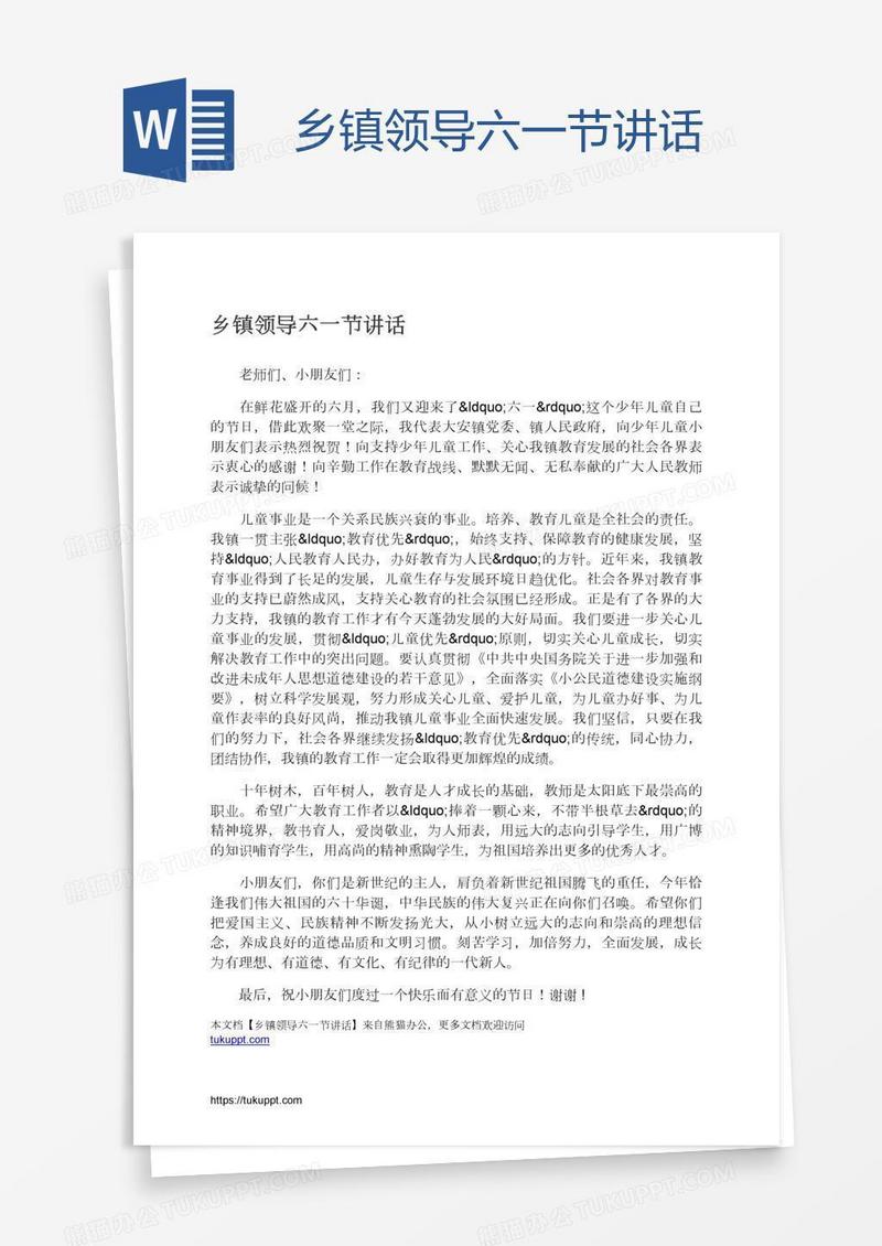 本作品为乡镇领导六一节讲话, 编号:71mdmvyrd1, 格式为 docx, 大小1 MB, 本作品下载后,先解压,解压之后用推荐软件 Word(2010) 打开, 然后进行编辑功能。