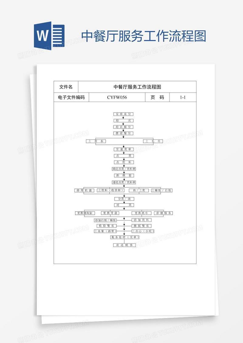 本作品为中餐厅服务工作流程图, 编号:71mdmymed1, 格式为 docx, 大小1 MB, 本作品下载后,先解压,解压之后用推荐软件 Word(2010) 打开, 然后进行编辑功能。