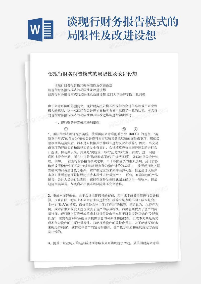 本作品为谈现行财务报告模式的局限性及改进设想, 编号:71mdrm0od1, 格式为 docx, 大小1 MB, 本作品下载后,先解压,解压之后用推荐软件 Word(2010) 打开, 然后进行编辑功能。
