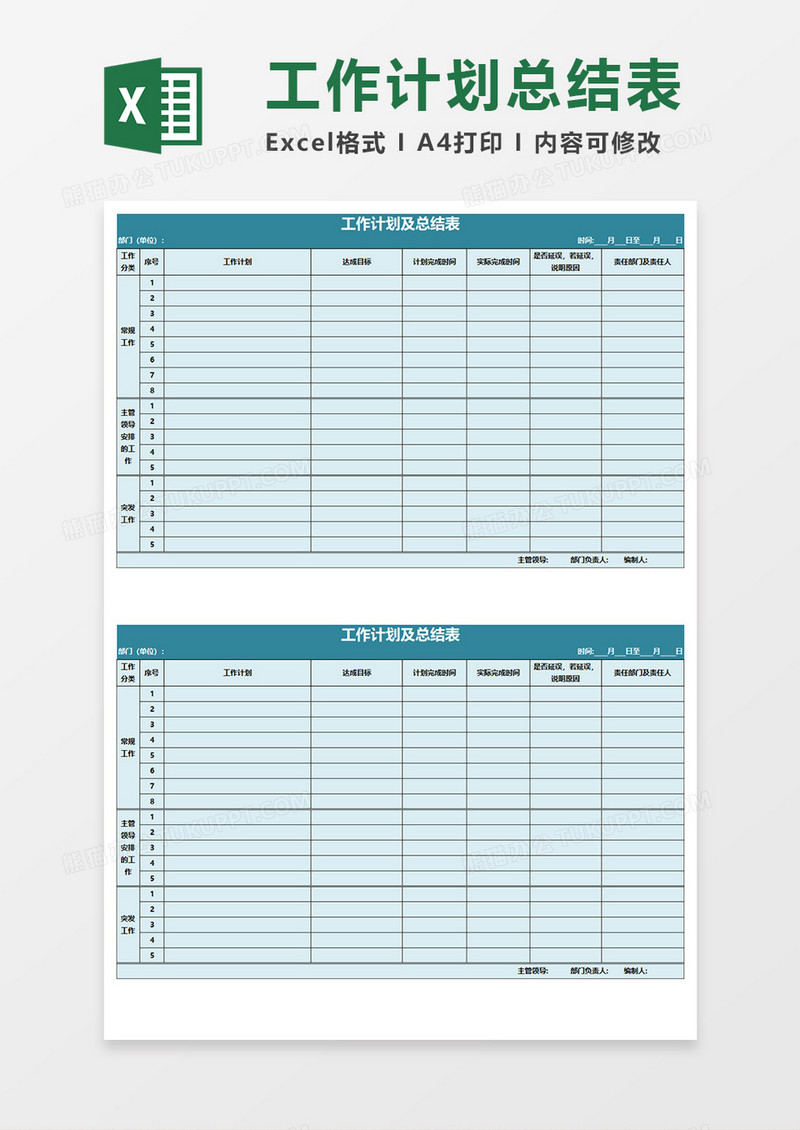 本作品为工作计划及总结表EXECL模板 , 编号:b1qy4kom69, 格式为 xls, 大小1 MB, 本作品下载后,先解压,解压之后用推荐软件 Excel(2016) 打开, 然后进行编辑功能。
