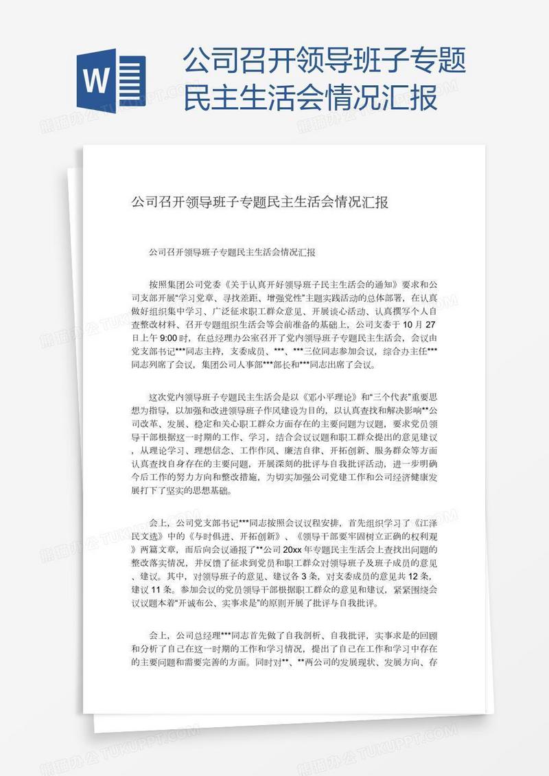 本作品为公司召开领导班子专题民主生活会情况汇报, 编号:b1qy4mo229, 格式为 docx, 大小1 MB, 本作品下载后,先解压,解压之后用推荐软件 Word(2010) 打开, 然后进行编辑功能。