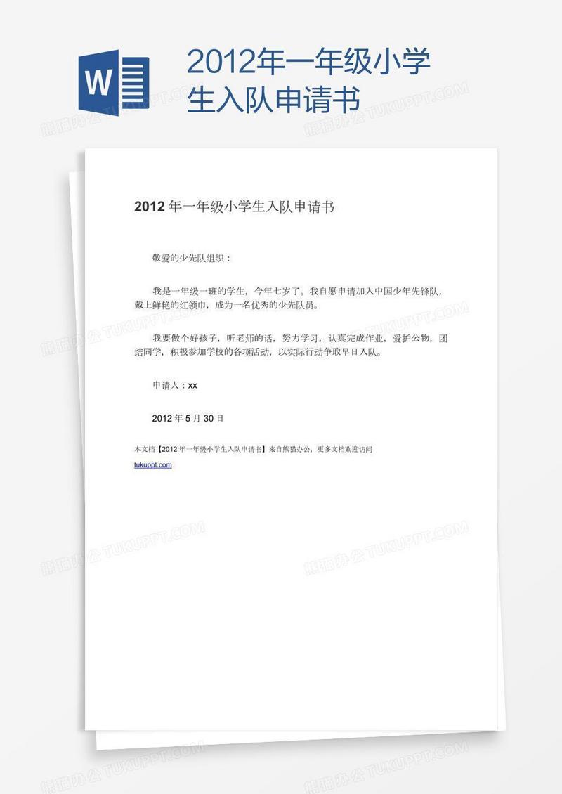 本作品为2012年一年级小学生入队申请书, 编号:b1qy4rn8r9, 格式为 docx, 大小1 MB, 本作品下载后,先解压,解压之后用推荐软件 Word(2010) 打开, 然后进行编辑功能。