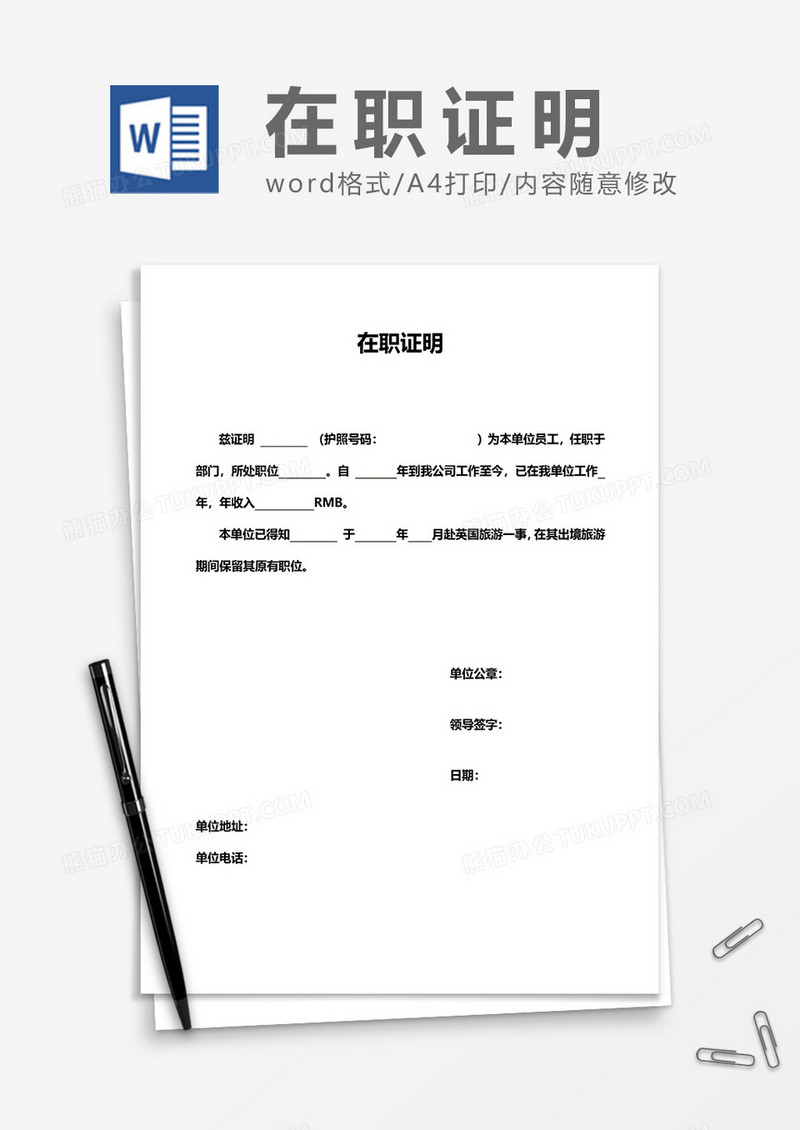 本作品为在职证明(出境可用)word模板, 编号:b1qy4vmgy9, 格式为 docx, 大小1 MB, 本作品下载后,先解压,解压之后用推荐软件 Word(2010) 打开, 然后进行编辑功能。