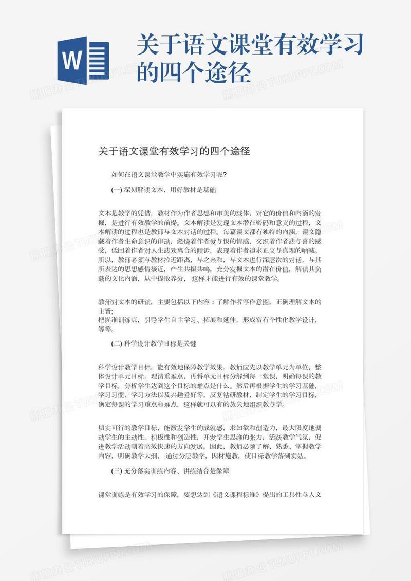 本作品为关于语文课堂有效学习的四个途径, 编号:b1qy65y569, 格式为 docx, 大小1 MB, 本作品下载后,先解压,解压之后用推荐软件 Word(2010) 打开, 然后进行编辑功能。