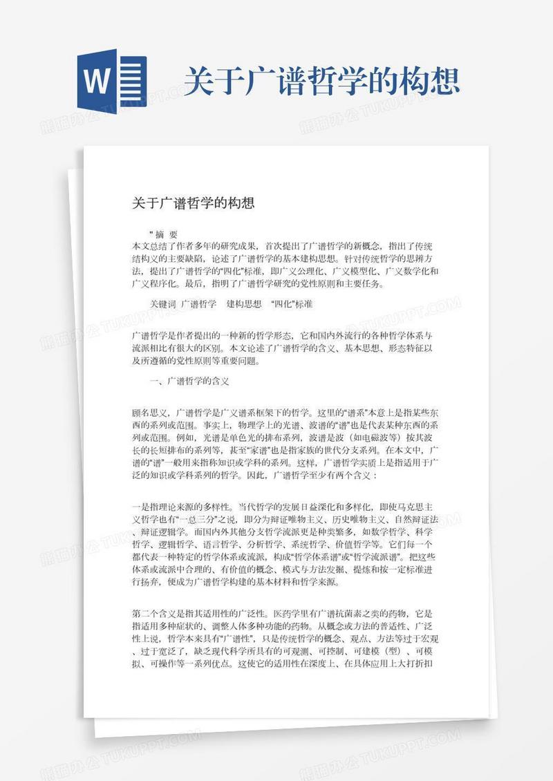 本作品为关于广谱哲学的构想, 编号:b1qy66krd9, 格式为 docx, 大小1 MB, 本作品下载后,先解压,解压之后用推荐软件 Word(2010) 打开, 然后进行编辑功能。