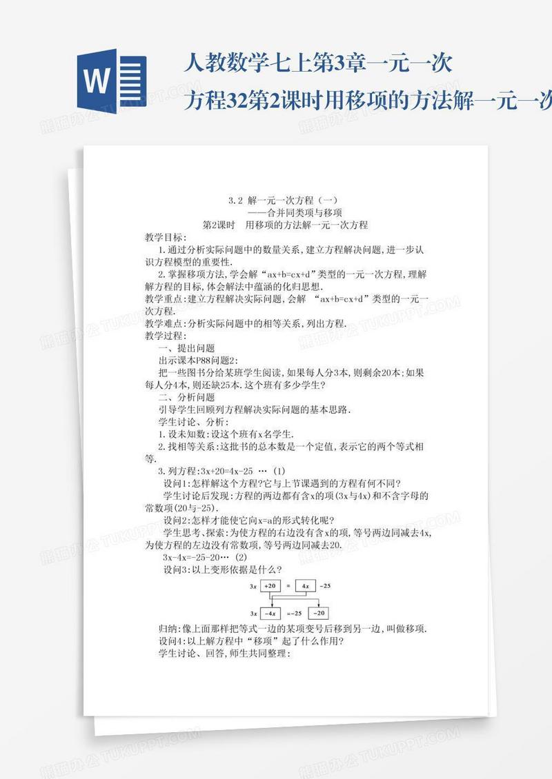 本作品为人教数学七上第3章一元一次方程3.2第2课时用移项的方法解一元一次方程, 编号:b1qy6ld029, 格式为 docx, 大小1 MB, 本作品下载后,先解压,解压之后用推荐软件 Word(2010) 打开, 然后进行编辑功能。