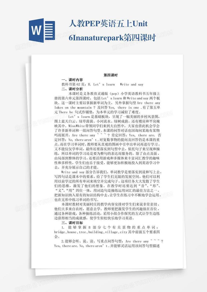 本作品为人教PEP英语五上Unit6Inanaturepark第四课时, 编号:b1qy6ld879, 格式为 docx, 大小3 MB, 本作品下载后,先解压,解压之后用推荐软件 Word(2010) 打开, 然后进行编辑功能。