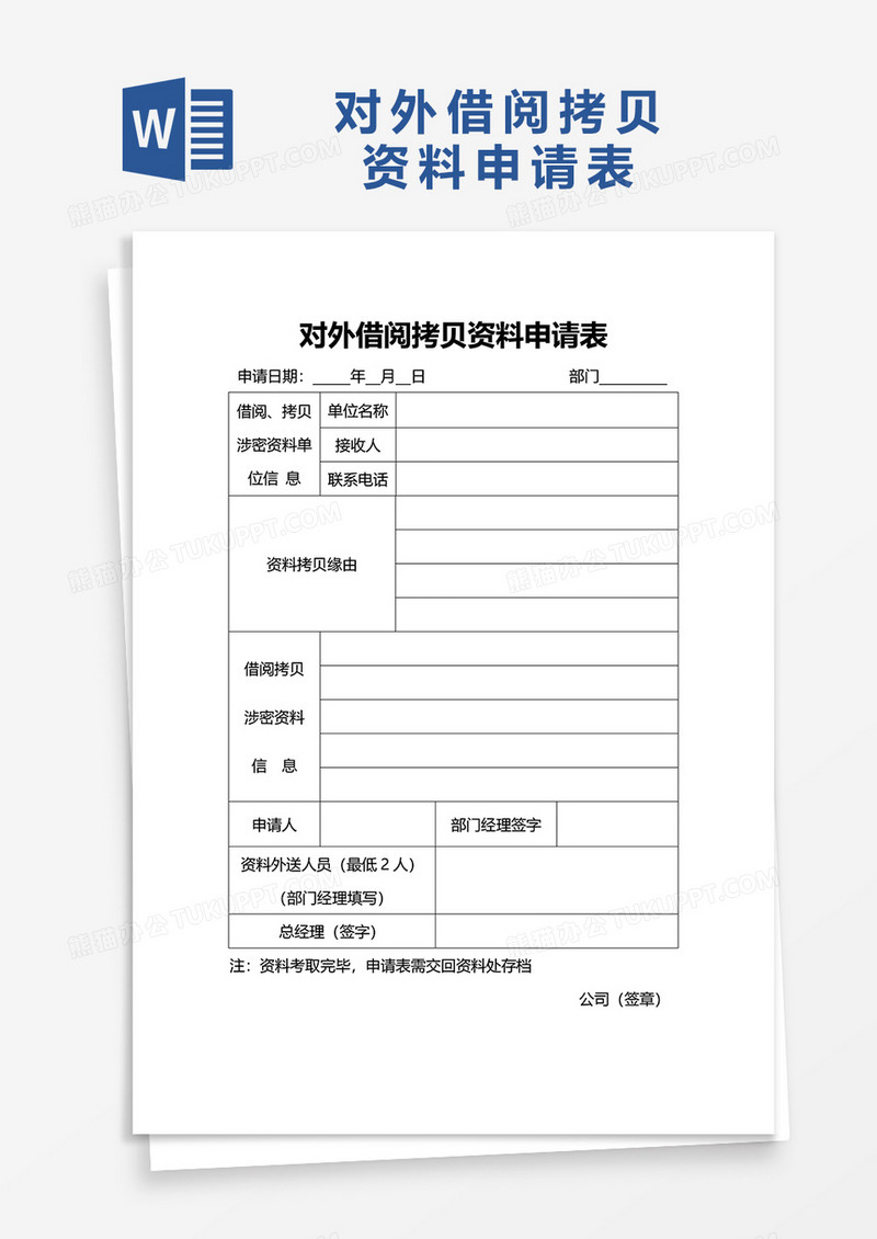 本作品为对外借阅拷贝资料申请表word模板, 编号:b1qy6pgr79, 格式为 docx, 大小1 MB, 本作品下载后,先解压,解压之后用推荐软件 Word(2019) 打开, 然后进行编辑功能。