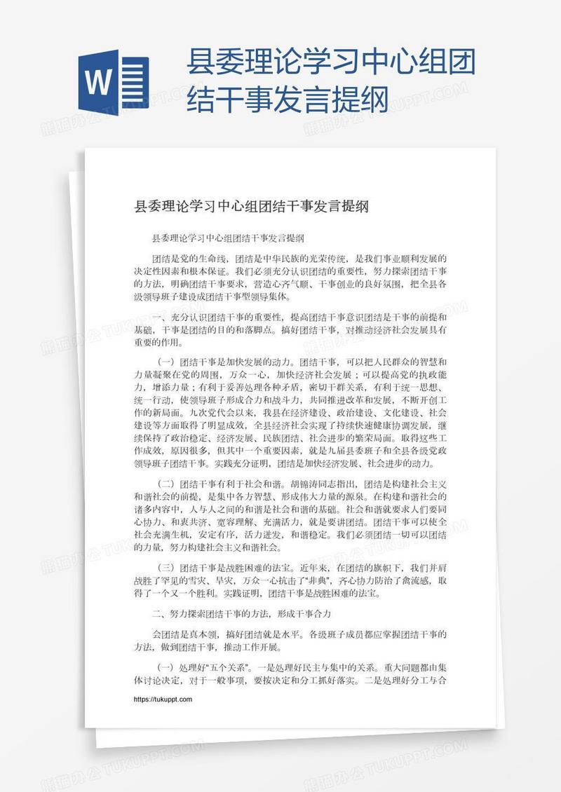 本作品为县委理论学习中心组团结干事发言提纲, 编号:b1qyo3mb29, 格式为 docx, 大小1 MB, 本作品下载后,先解压,解压之后用推荐软件 Word(2010) 打开, 然后进行编辑功能。