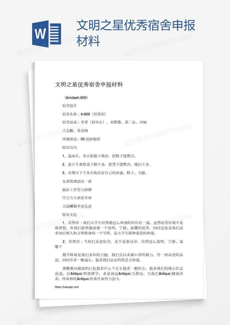 本作品为文明之星优秀宿舍申报材料, 编号:b1qyo7ew29, 格式为 docx, 大小1 MB, 本作品下载后,先解压,解压之后用推荐软件 Word(2010) 打开, 然后进行编辑功能。