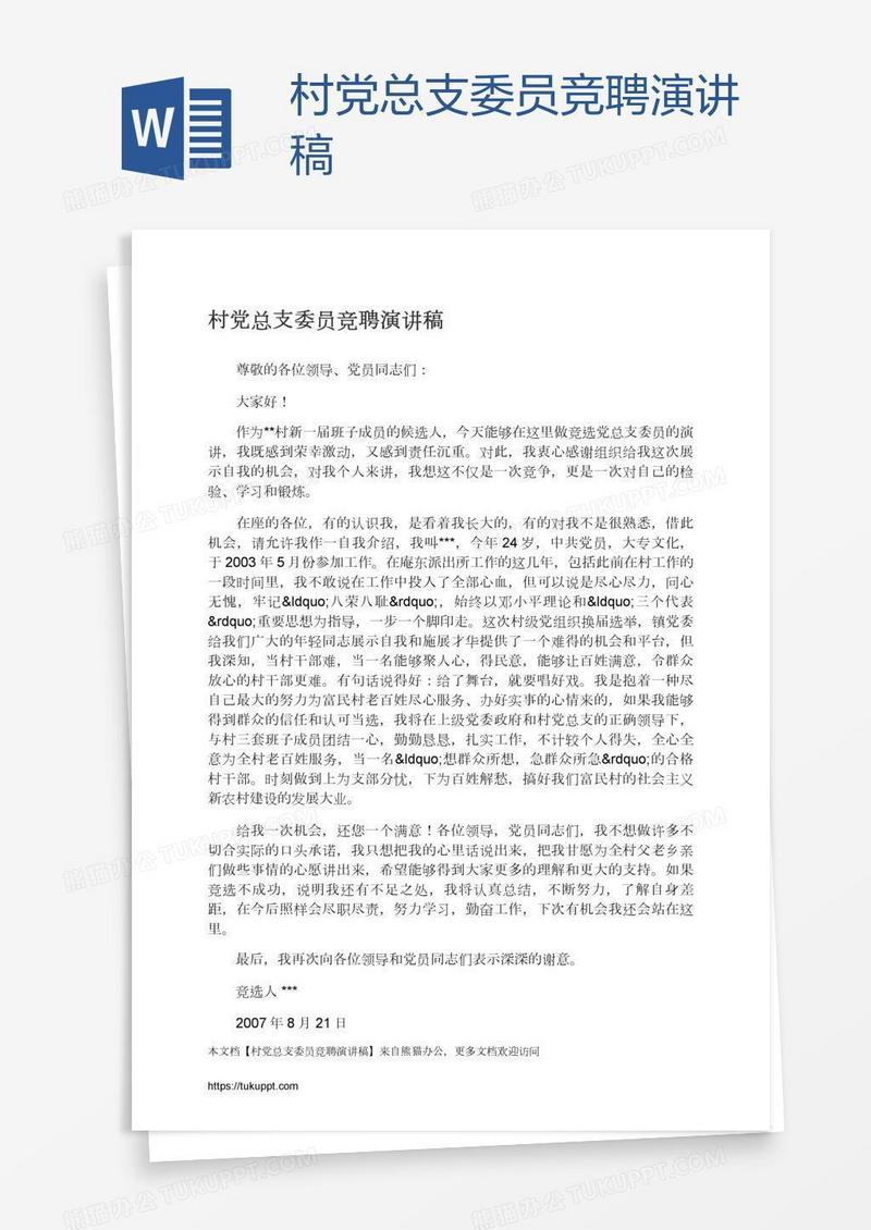 本作品为村党总支委员竞聘演讲稿, 编号:b1qyo85qr9, 格式为 docx, 大小1 MB, 本作品下载后,先解压,解压之后用推荐软件 Word(2010) 打开, 然后进行编辑功能。