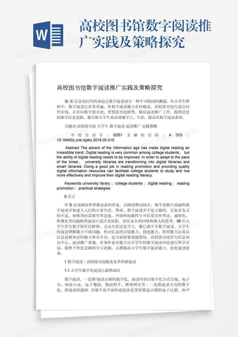 本作品为高校图书馆数字阅读推广实践及策略探究, 编号:b1qyo8mdy9, 格式为 docx, 大小1 MB, 本作品下载后,先解压,解压之后用推荐软件 Word(2010) 打开, 然后进行编辑功能。