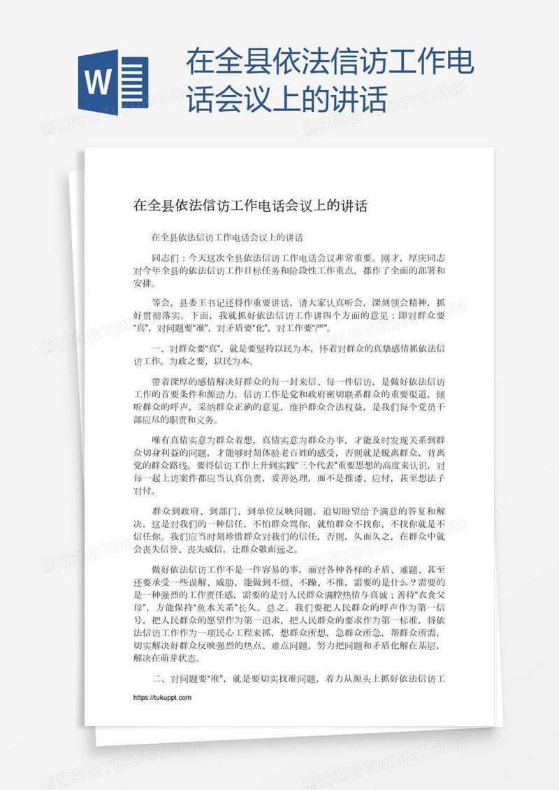 本作品为在全县依法信访工作电话会议上的讲话, 编号:b1qyoe2579, 格式为 docx, 大小1 MB, 本作品下载后,先解压,解压之后用推荐软件 Word(2010) 打开, 然后进行编辑功能。