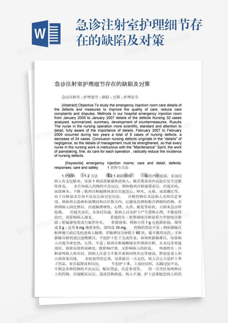 本作品为急诊注射室护理细节存在的缺陷及对策, 编号:b1qyoj3k69, 格式为 docx, 大小1 MB, 本作品下载后,先解压,解压之后用推荐软件 Word(2010) 打开, 然后进行编辑功能。