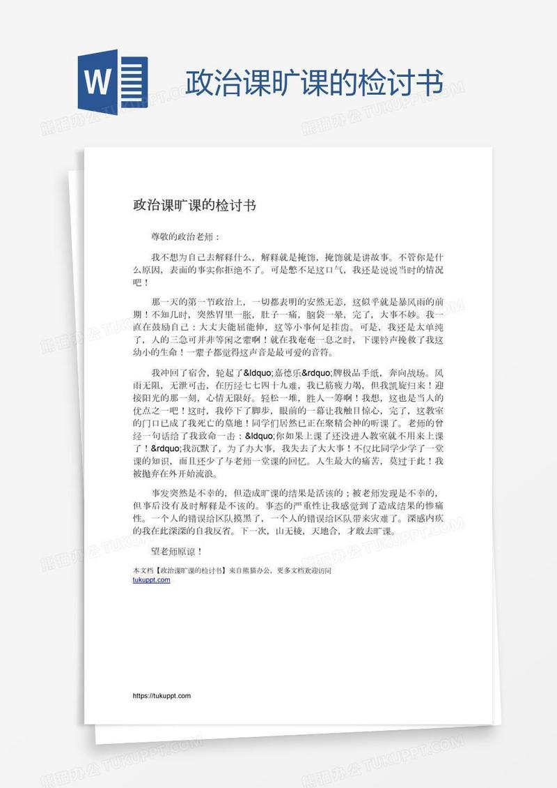 本作品为政治课旷课的检讨书, 编号:b1qyoklq69, 格式为 docx, 大小1 MB, 本作品下载后,先解压,解压之后用推荐软件 Word(2010) 打开, 然后进行编辑功能。