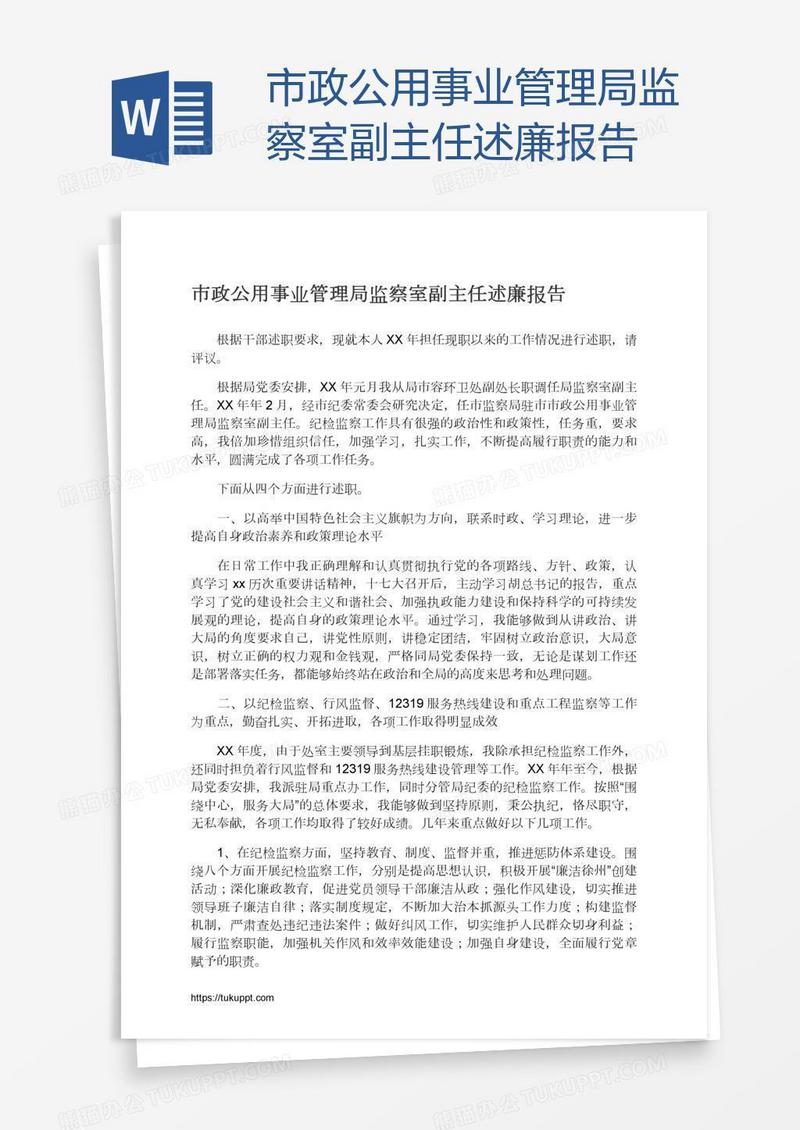 本作品为市政公用事业管理局监察室副主任述廉报告, 编号:b1qyokynr9, 格式为 docx, 大小1 MB, 本作品下载后,先解压,解压之后用推荐软件 Word(2010) 打开, 然后进行编辑功能。