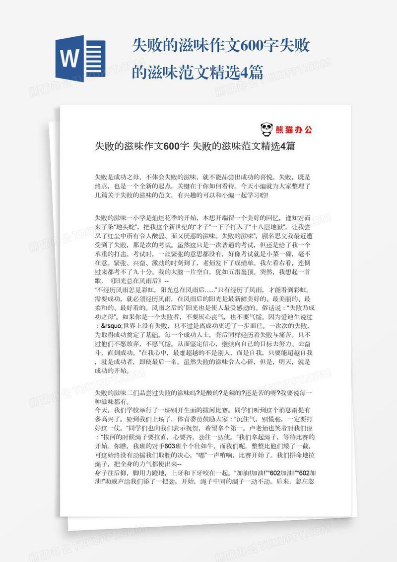 本作品为失败的滋味作文600字失败的滋味范文精选4篇, 编号:b1qyomd2r9, 格式为 docx, 大小1 MB, 本作品下载后,先解压,解压之后用推荐软件 Word(2010) 打开, 然后进行编辑功能。