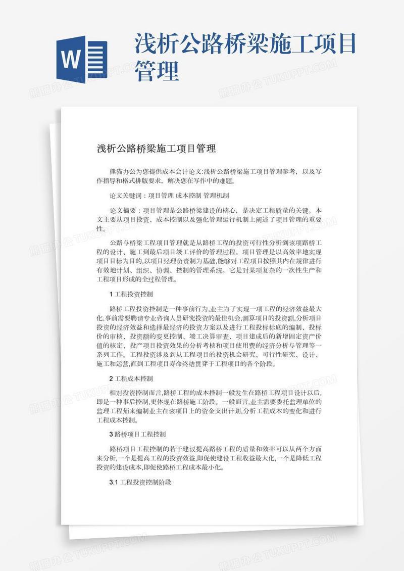 本作品为浅析公路桥梁施工项目管理, 编号:b1qyoqjp29, 格式为 docx, 大小1 MB, 本作品下载后,先解压,解压之后用推荐软件 Word(2010) 打开, 然后进行编辑功能。