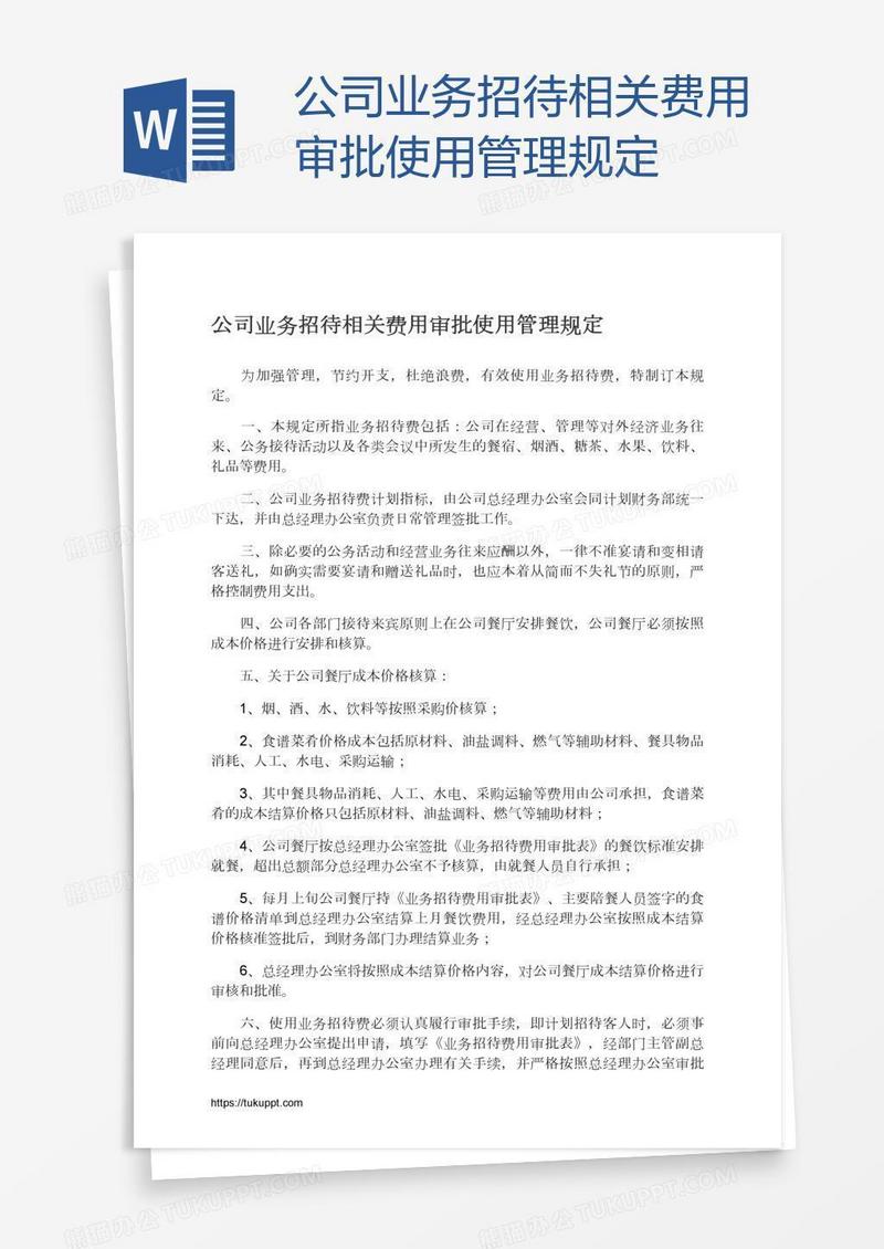 本作品为公司业务招待相关费用审批使用管理规定, 编号:b1qyov05y9, 格式为 docx, 大小1 MB, 本作品下载后,先解压,解压之后用推荐软件 Word(2010) 打开, 然后进行编辑功能。