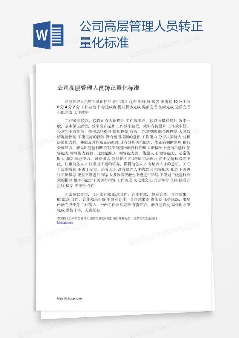 本作品为公司高层管理人员转正量化标准, 编号:b1qyovmdd9, 格式为 docx, 大小1 MB, 本作品下载后,先解压,解压之后用推荐软件 Word(2010) 打开, 然后进行编辑功能。