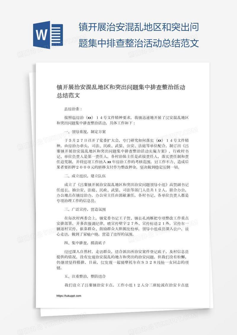 本作品为镇开展治安混乱地区和突出问题集中排查整治活动总结范文, 编号:b1qyoyv779, 格式为 docx, 大小1 MB, 本作品下载后,先解压,解压之后用推荐软件 Word(2010) 打开, 然后进行编辑功能。