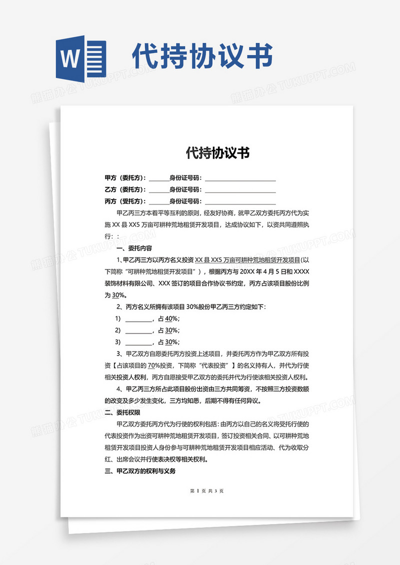本作品为代持协议书word模板, 编号:bad5kq23y9, 格式为 docx, 大小1 MB, 本作品下载后,先解压,解压之后用推荐软件 Word(2019) 打开, 然后进行编辑功能。