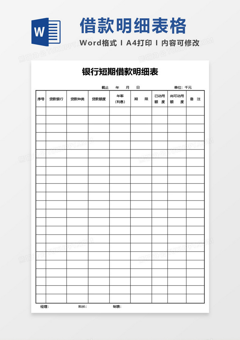 本作品为银行短期借款明细表word模板, 编号:bad5r00lv9, 格式为 wps, 大小1 MB, 本作品下载后,先解压,解压之后用推荐软件 Word(2016) 打开, 然后进行编辑功能。