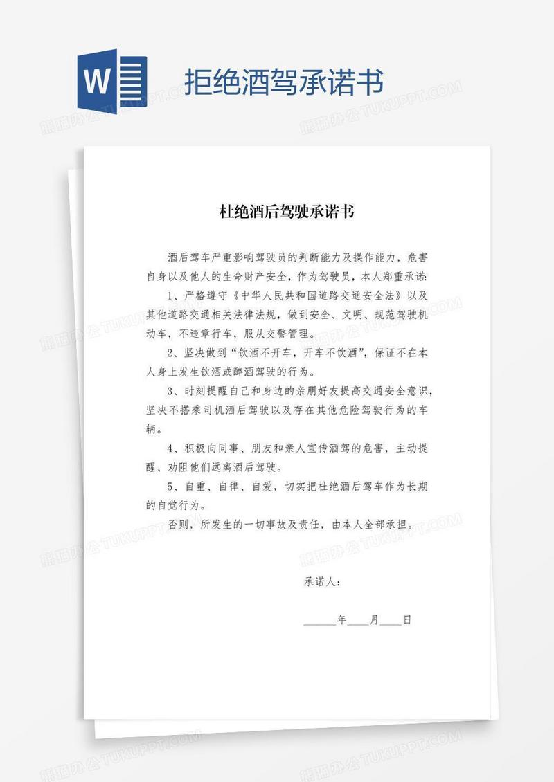 本作品为拒绝酒驾承诺书, 编号:bad5r2voy9, 格式为 doc, 大小1 MB, 本作品下载后,先解压,解压之后用推荐软件 Word(2010) 打开, 然后进行编辑功能。