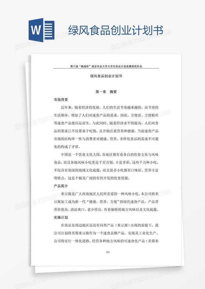 本作品为绿风食品创业计划书, 编号:bad5r7pyq9, 格式为 doc, 大小3 MB, 本作品下载后,先解压,解压之后用推荐软件 Word(2010) 打开, 然后进行编辑功能。