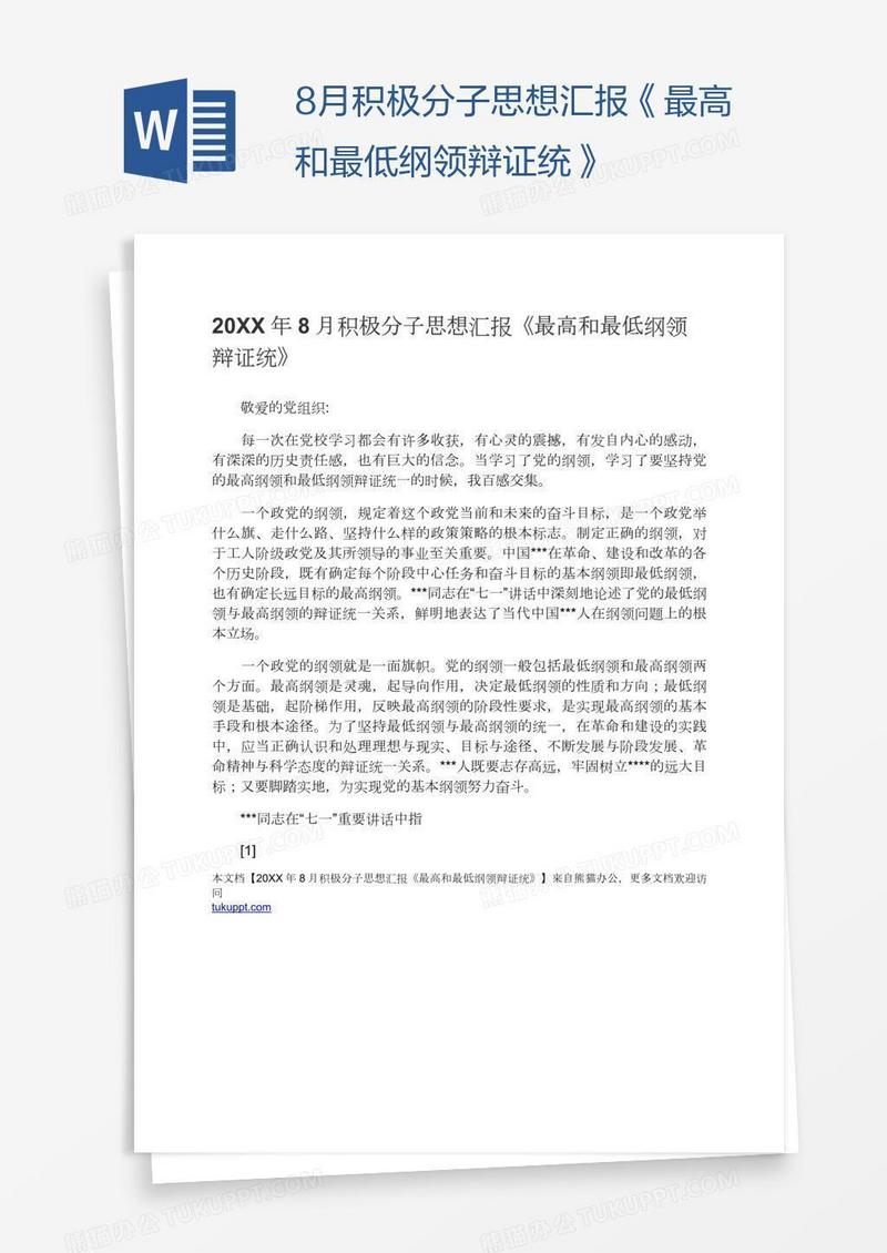本作品为8月积极分子思想汇报《最高和最低纲领辩证统》, 编号:bad5r8ekq9, 格式为 docx, 大小1 MB, 本作品下载后,先解压,解压之后用推荐软件 Word(2010) 打开, 然后进行编辑功能。