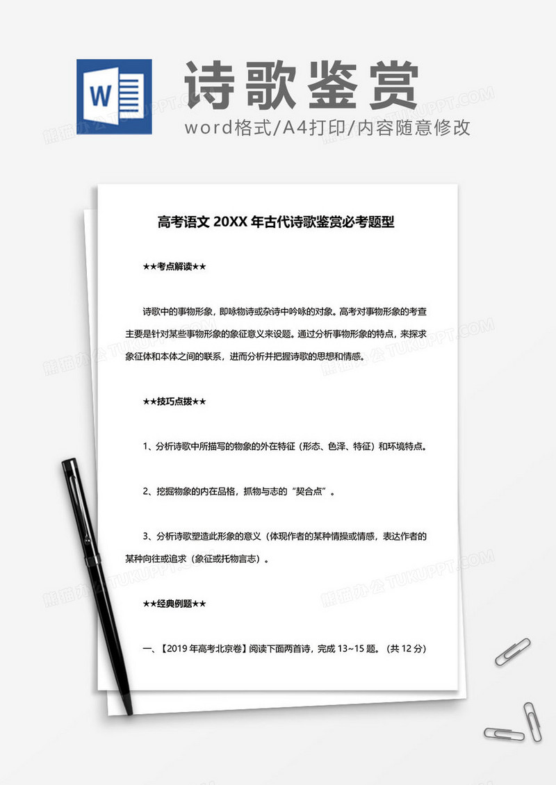 本作品为高考语文古代诗歌鉴赏必考题型word模板, 编号:bad5ro3579, 格式为 docx, 大小1 MB, 本作品下载后,先解压,解压之后用推荐软件 Word(2019) 打开, 然后进行编辑功能。