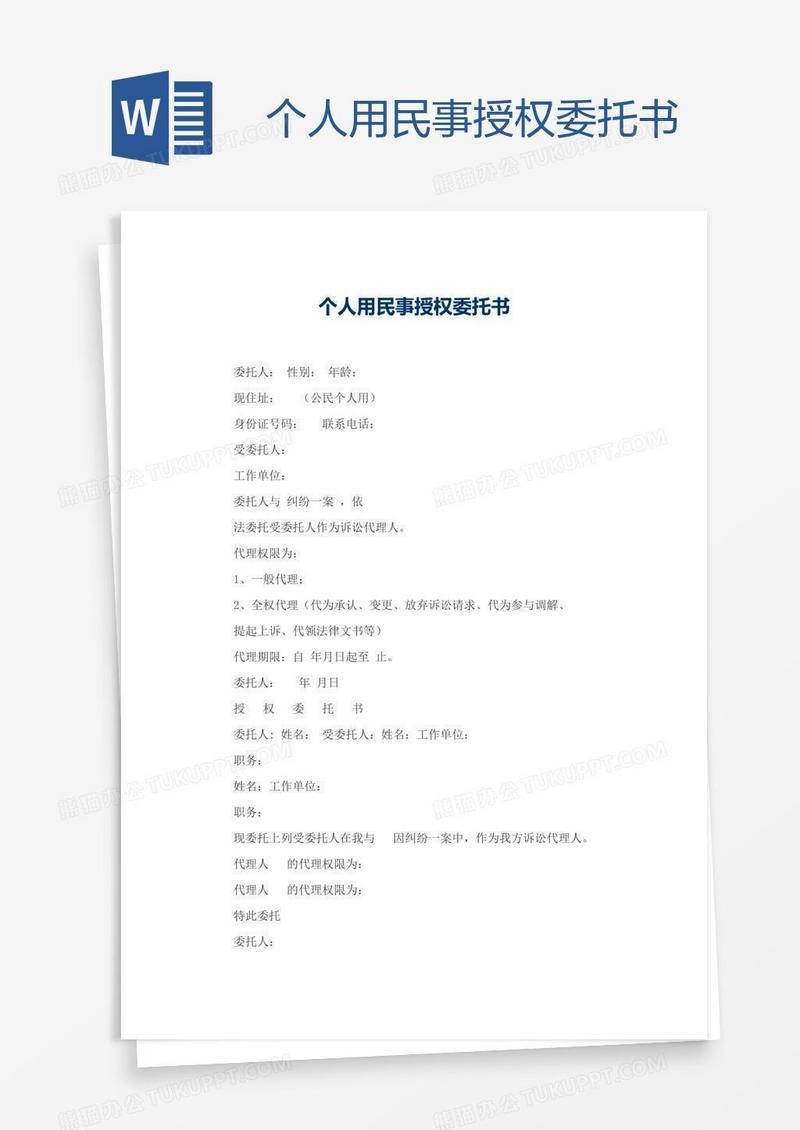 本作品为个人用民事授权委托书, 编号:bad5rvw4y9, 格式为 docx, 大小1 MB, 本作品下载后,先解压,解压之后用推荐软件 Word(2010) 打开, 然后进行编辑功能。