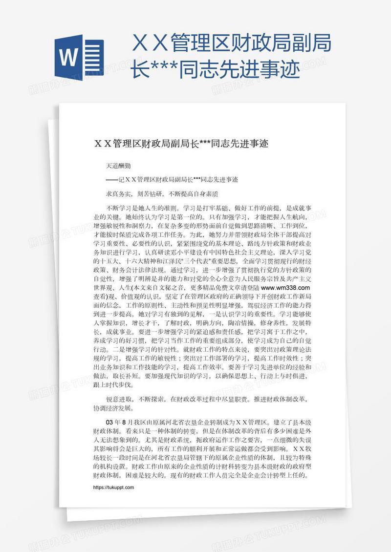 本作品为XX管理区财政局副局长***同志先进事迹, 编号:bad5w0ogr9, 格式为 docx, 大小1 MB, 本作品下载后,先解压,解压之后用推荐软件 Word(2010) 打开, 然后进行编辑功能。