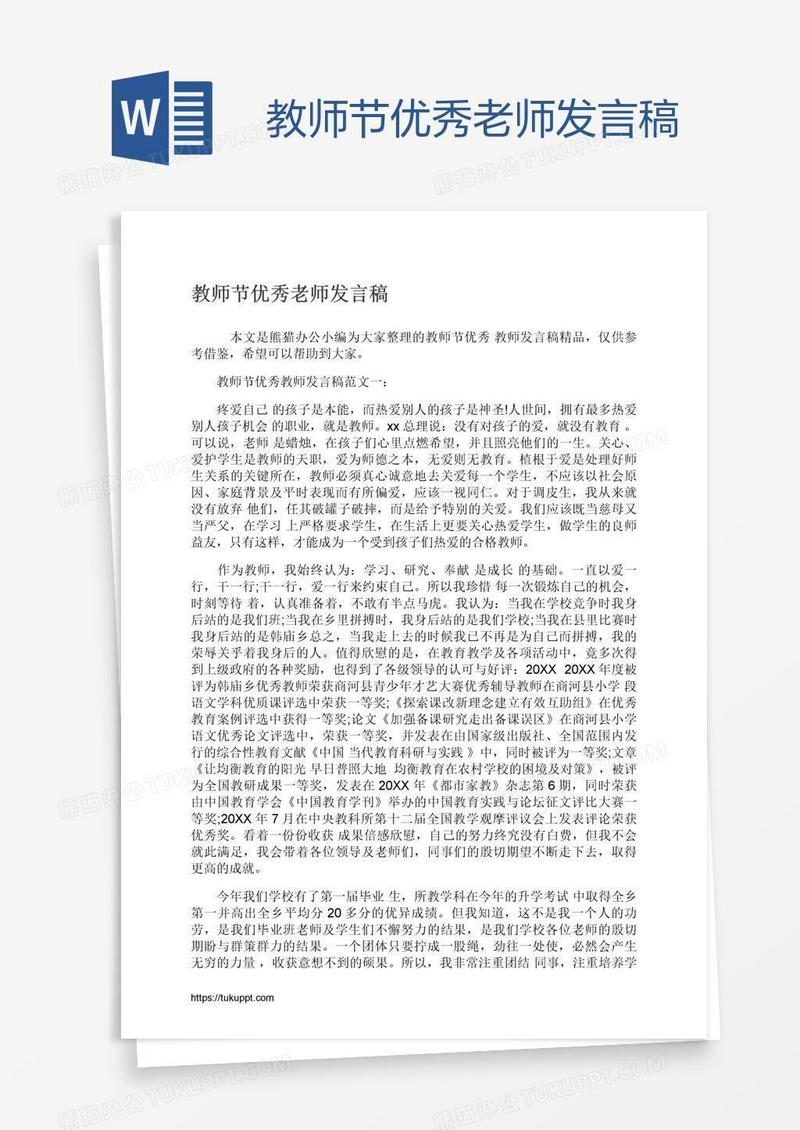 本作品为教师节优秀老师发言稿, 编号:bad5w52ny9, 格式为 docx, 大小1 MB, 本作品下载后,先解压,解压之后用推荐软件 Word(2010) 打开, 然后进行编辑功能。