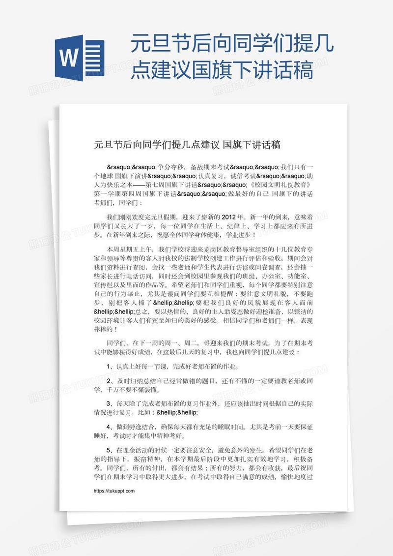 本作品为元旦节后向同学们提几点建议国旗下讲话稿, 编号:bad5w7k8j9, 格式为 docx, 大小1 MB, 本作品下载后,先解压,解压之后用推荐软件 Word(2010) 打开, 然后进行编辑功能。