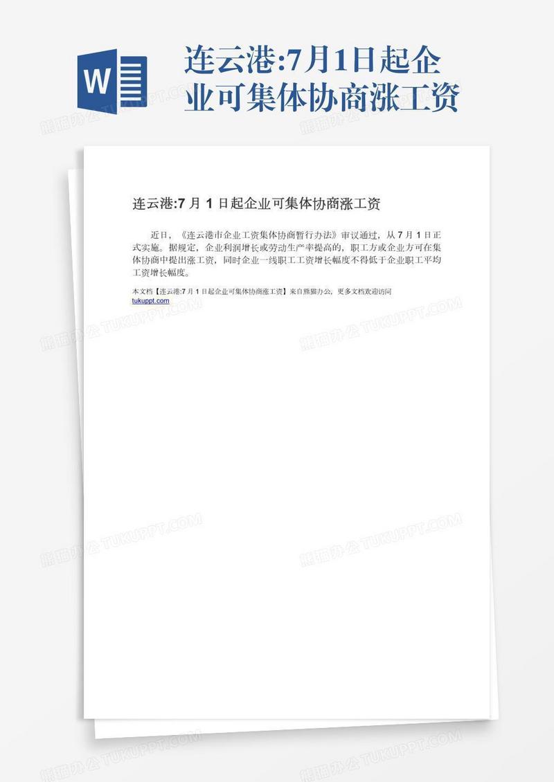 本作品为连云港:7月1日起企业可集体协商涨工资, 编号:bad5wdglr9, 格式为 docx, 大小1 MB, 本作品下载后,先解压,解压之后用推荐软件 Word(2010) 打开, 然后进行编辑功能。