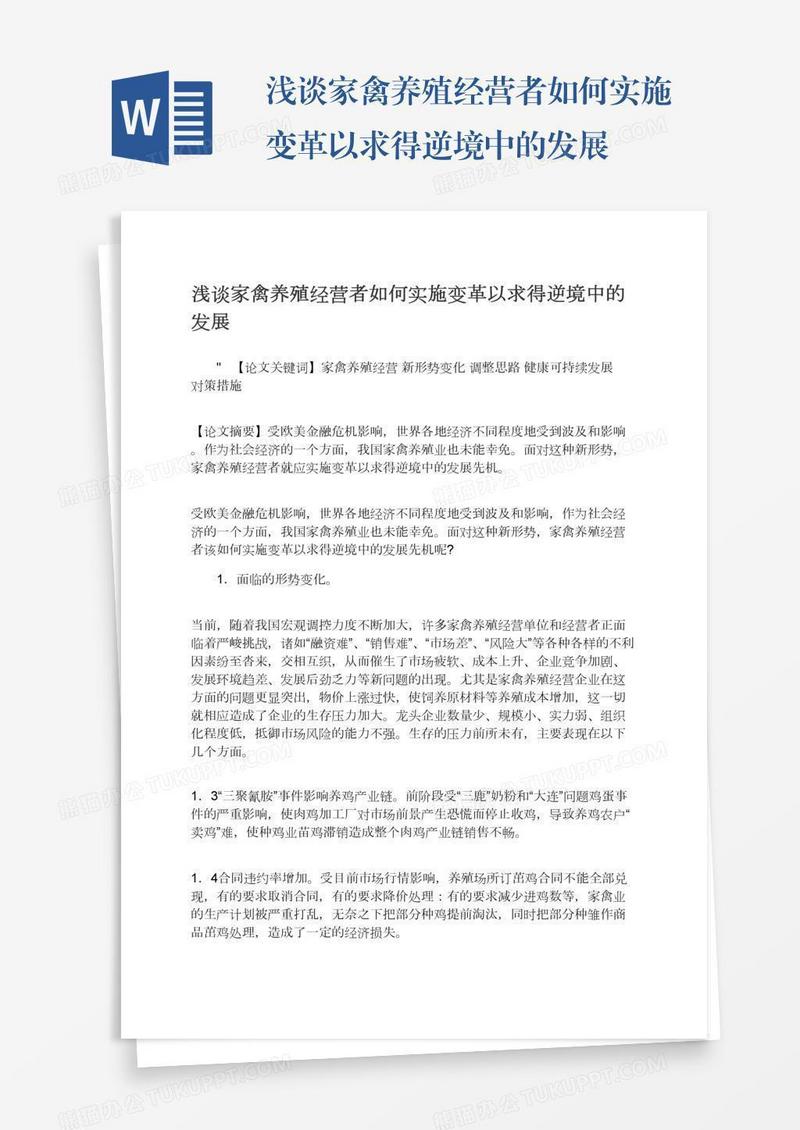 本作品为浅谈家禽养殖经营者如何实施变革以求得逆境中的发展, 编号:bad5wdweq9, 格式为 docx, 大小1 MB, 本作品下载后,先解压,解压之后用推荐软件 Word(2010) 打开, 然后进行编辑功能。