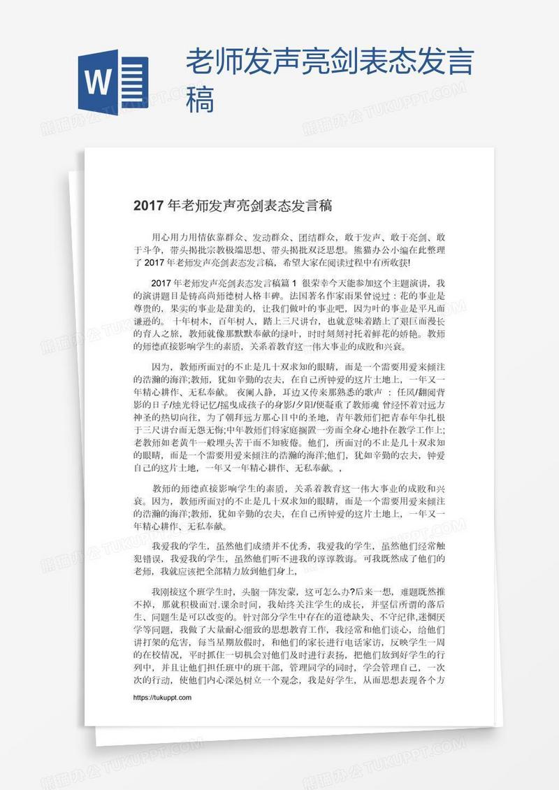 本作品为老师发声亮剑表态发言稿, 编号:bad5wg3m79, 格式为 docx, 大小1 MB, 本作品下载后,先解压,解压之后用推荐软件 Word(2010) 打开, 然后进行编辑功能。