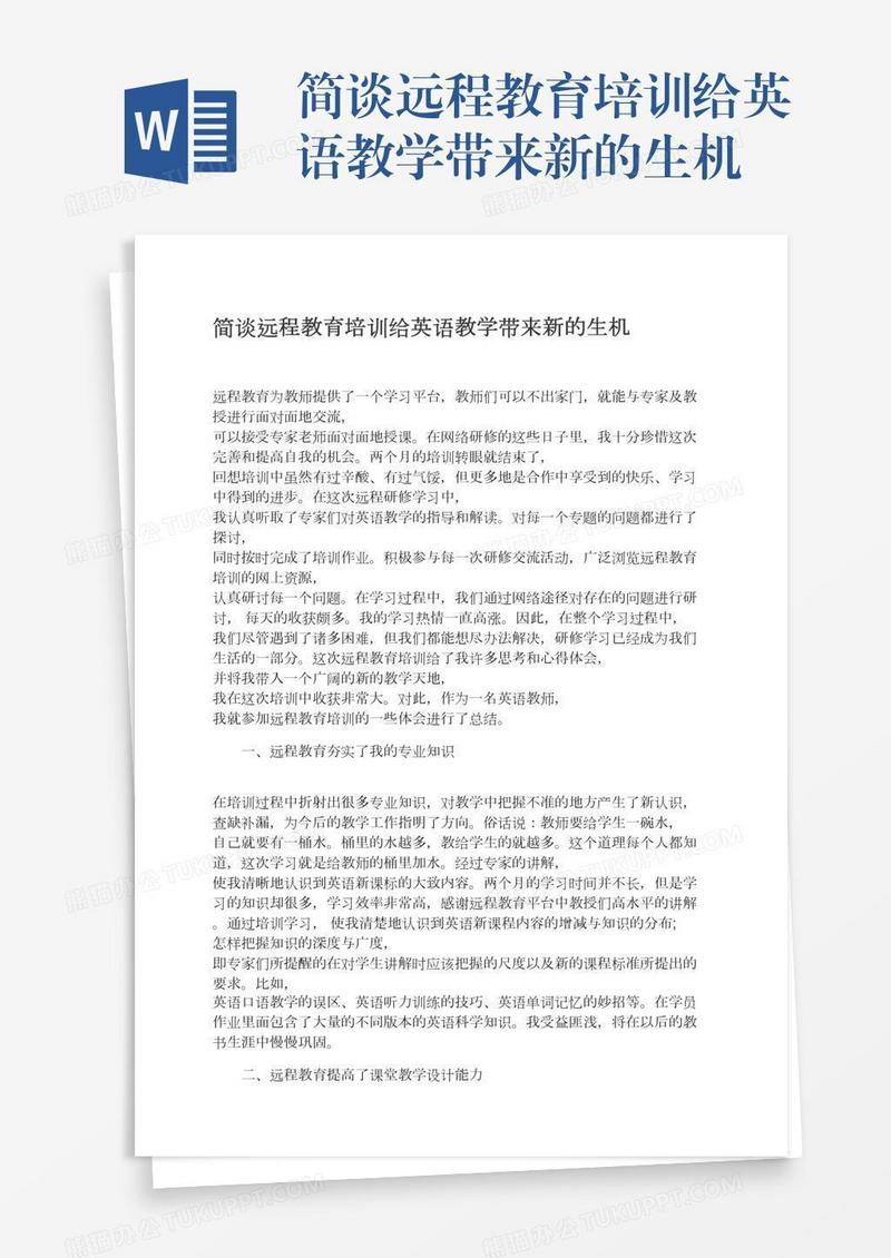 本作品为简谈远程教育培训给英语教学带来新的生机, 编号:bad5wjwwj9, 格式为 docx, 大小1 MB, 本作品下载后,先解压,解压之后用推荐软件 Word(2010) 打开, 然后进行编辑功能。