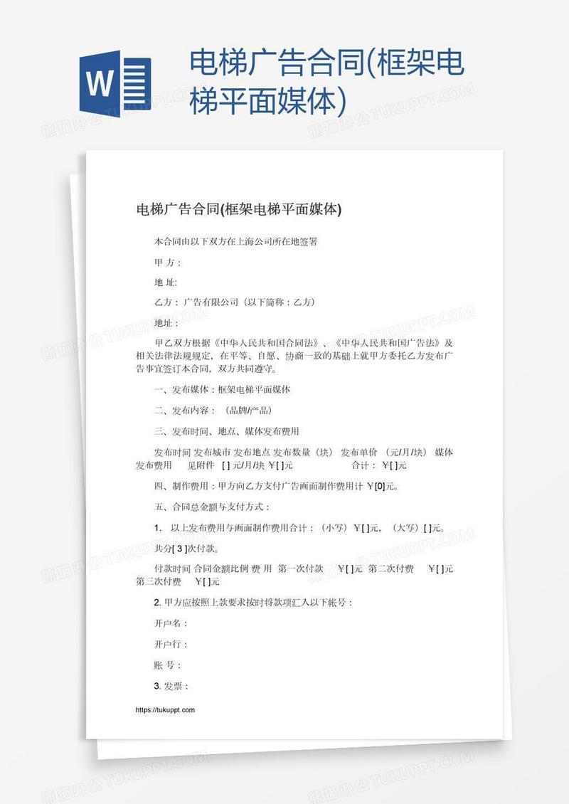 本作品为电梯广告合同(框架电梯平面媒体), 编号:bad5wmw279, 格式为 docx, 大小1 MB, 本作品下载后,先解压,解压之后用推荐软件 Word(2010) 打开, 然后进行编辑功能。