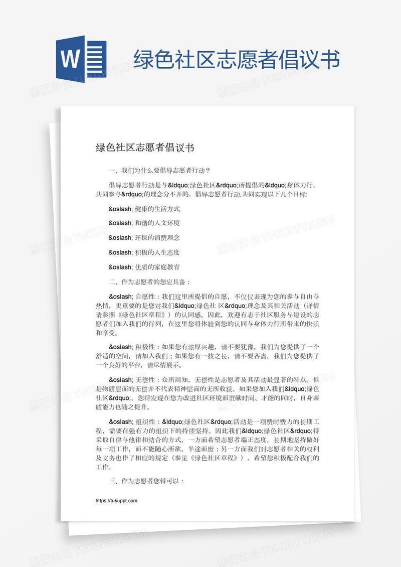 本作品为绿色社区志愿者倡议书, 编号:bad5wnvvj9, 格式为 docx, 大小1 MB, 本作品下载后,先解压,解压之后用推荐软件 Word(2010) 打开, 然后进行编辑功能。
