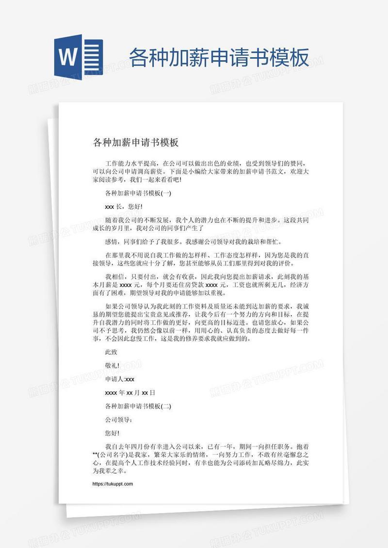 本作品为各种加薪申请书模板, 编号:bad5wqymj9, 格式为 docx, 大小1 MB, 本作品下载后,先解压,解压之后用推荐软件 Word(2010) 打开, 然后进行编辑功能。