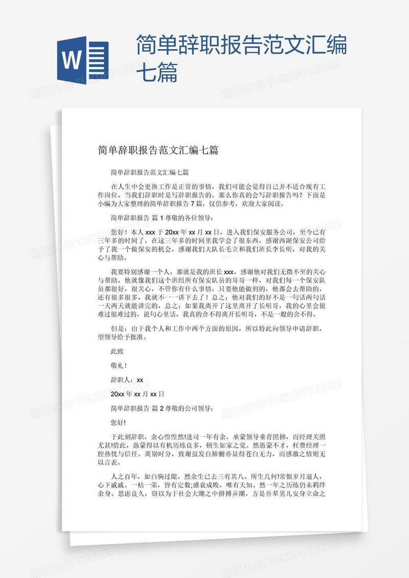 本作品为简单辞职报告范文汇编七篇, 编号:daen32drba, 格式为 docx, 大小1 MB, 本作品下载后,先解压,解压之后用推荐软件 Word(2010) 打开, 然后进行编辑功能。