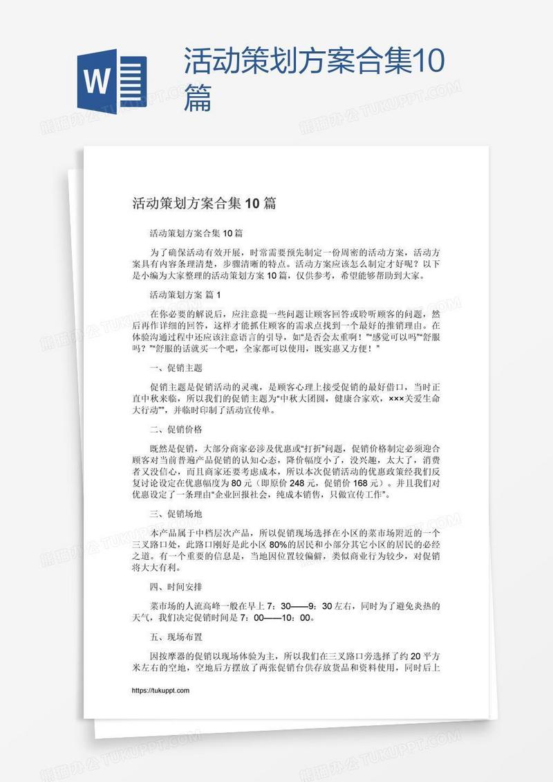 本作品为活动策划方案合集10篇, 编号:daen32kdba, 格式为 docx, 大小1 MB, 本作品下载后,先解压,解压之后用推荐软件 Word(2010) 打开, 然后进行编辑功能。