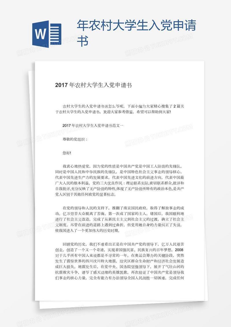 本作品为年农村大学生入党申请书, 编号:daen3ew2ba, 格式为 docx, 大小1 MB, 本作品下载后,先解压,解压之后用推荐软件 Word(2010) 打开, 然后进行编辑功能。